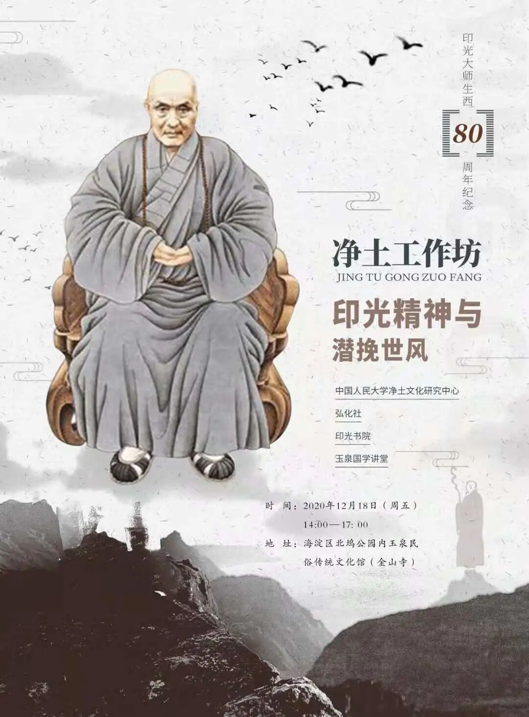 2020年12月18日,农历十一月初四,是民国四大高僧之一、中国净土宗十三祖印光大师生西八十周年纪念日,中国人民大学净土文化研究中心会同弘化社、印光书院、玉泉国学讲堂于北坞公园金山寺举办主题为“印光精神与潜挽世风”净土工作坊,共同研讨净土文化在当代的转换。