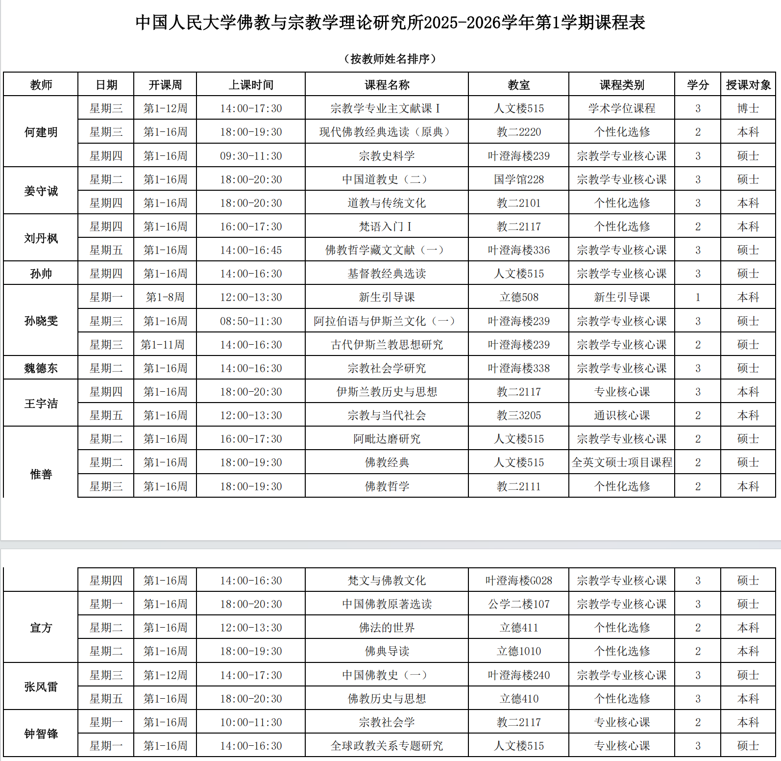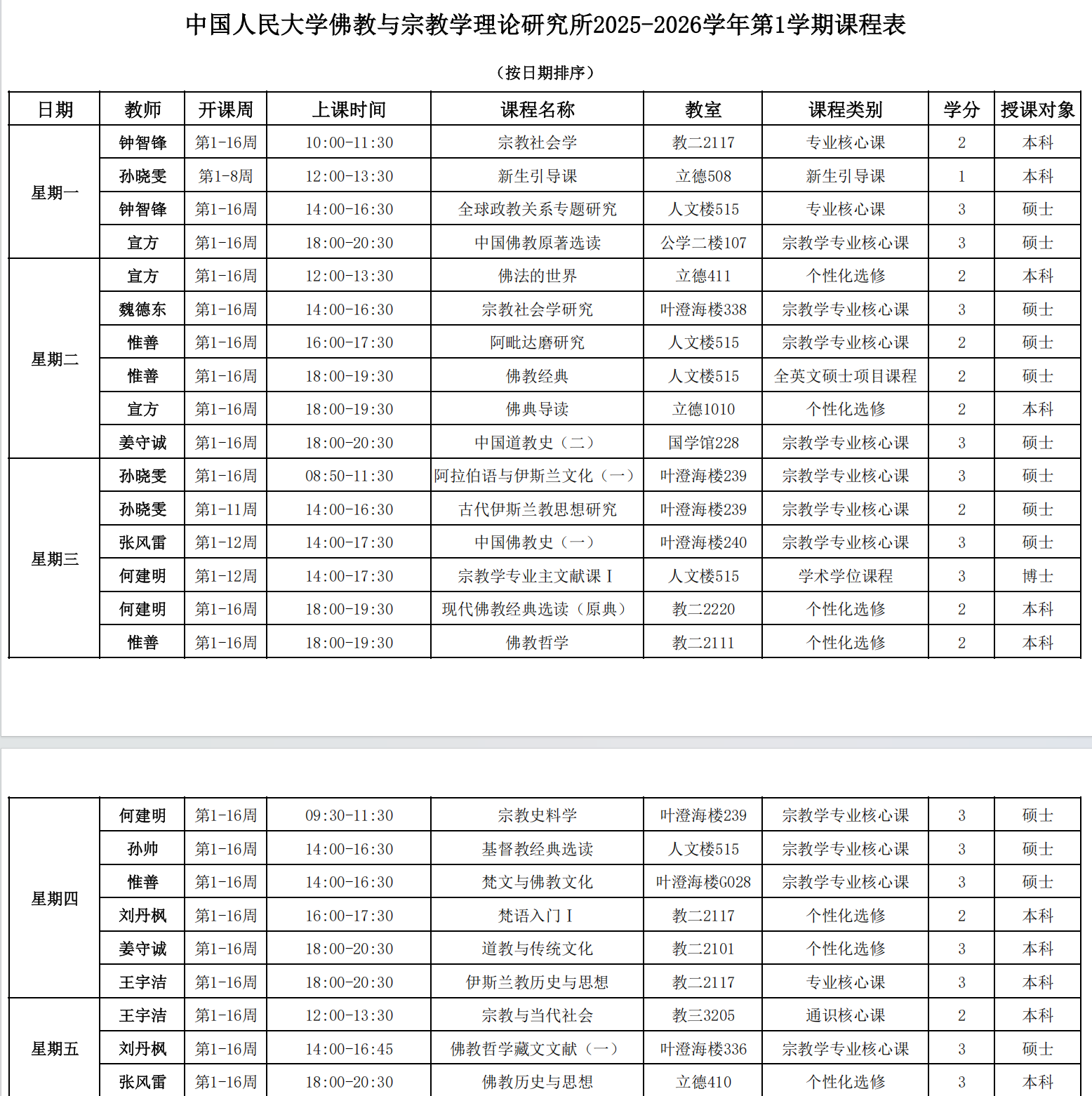 中国人民大学佛教与宗教学理论研究所2025-2026学年第1学期课程表.pdf