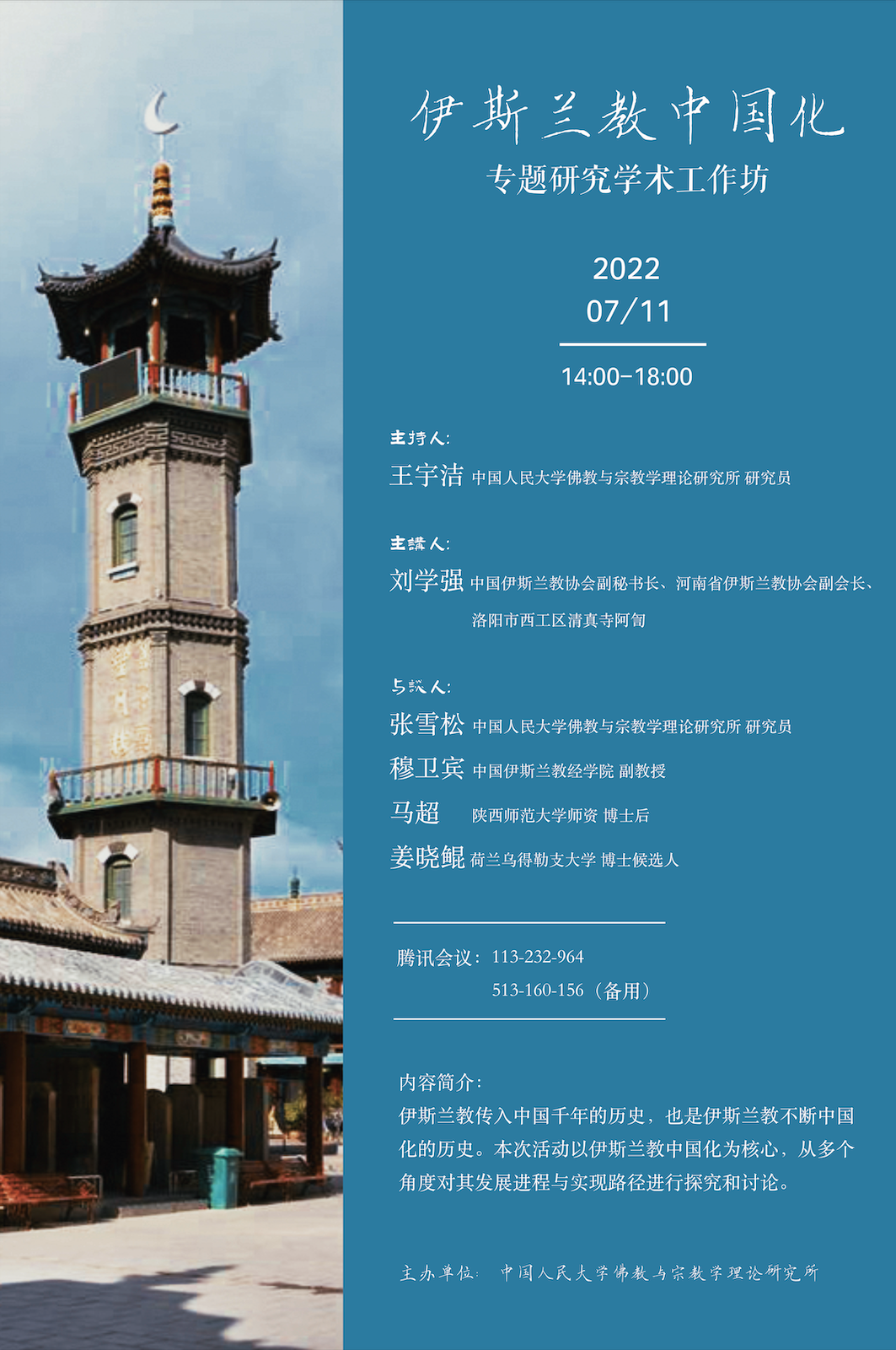 内容简介:伊斯兰教传入中国千年的历史,也是伊斯兰教不断中国化的历史。本次活动以伊斯兰教中国化为核心,从多个角度对其发展进程与实现路径进行研究和讨论。
